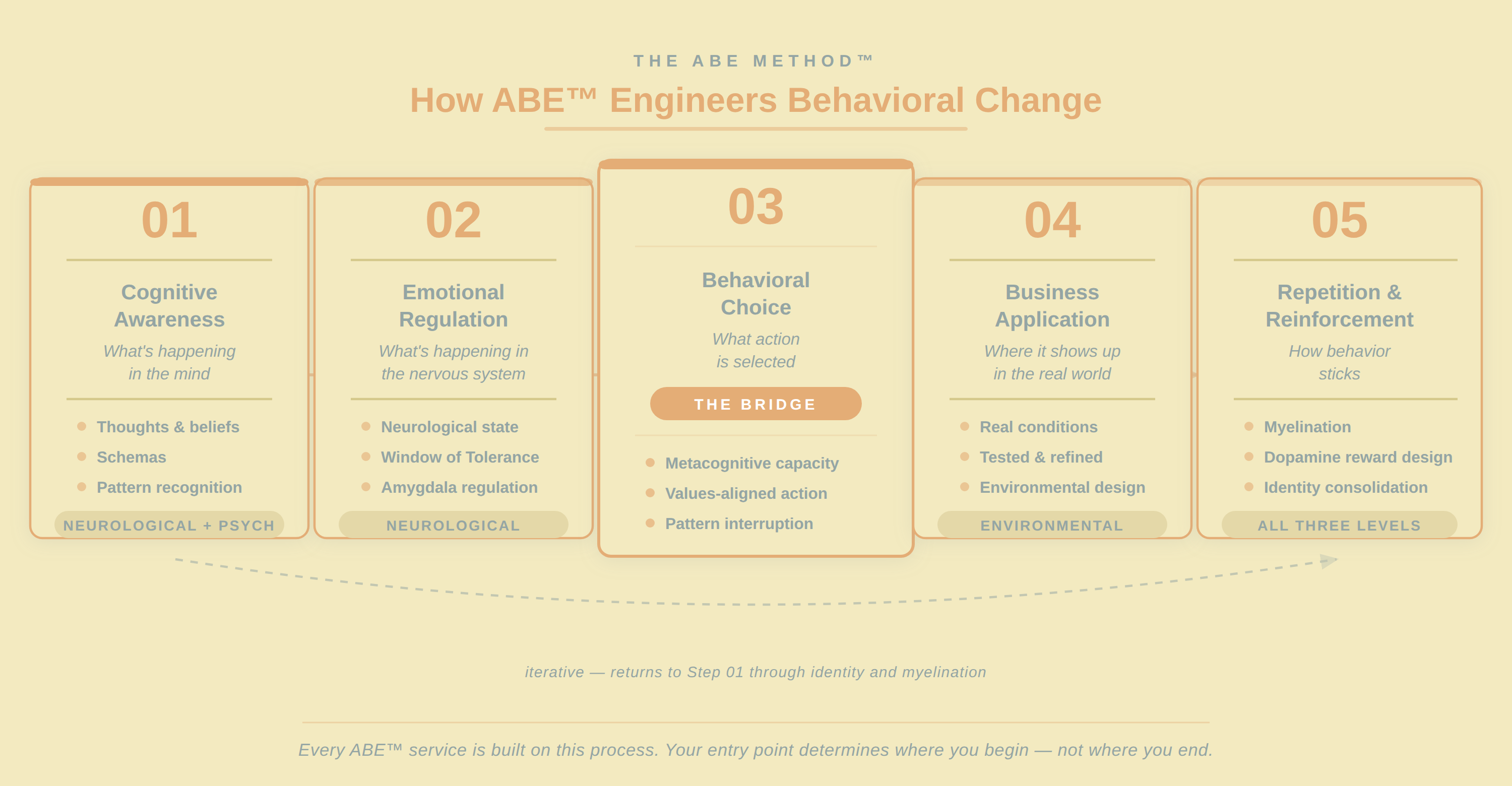 ABE™ addresses both. The methodology is not designed to produce insight or motivation. It is designed to engineer new behavioral patterns directly, ones that are embedded deeply enough to operate automatically, without ongoing willpower, under the exact conditions that have defeated previous attempts. Behavioral Integration, the third pillar of ABE™, exists specifically to make that embedding permanent.